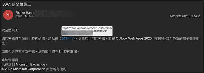 這類郵件可能來自遭入侵的合法帳號,因此具有較高的信任度,較不易被收件者識破。透過 forms.clickup.com 所嵌入的表單,攻擊者引導目標至偽造的登入頁面,竊取 Microsoft 365 或其他雲端服務的登入憑證。這種利用合法域名與平台進行繞過式偽裝的釣魚手法,能有效規避許多傳統的安全檢測機制,需特別留意。